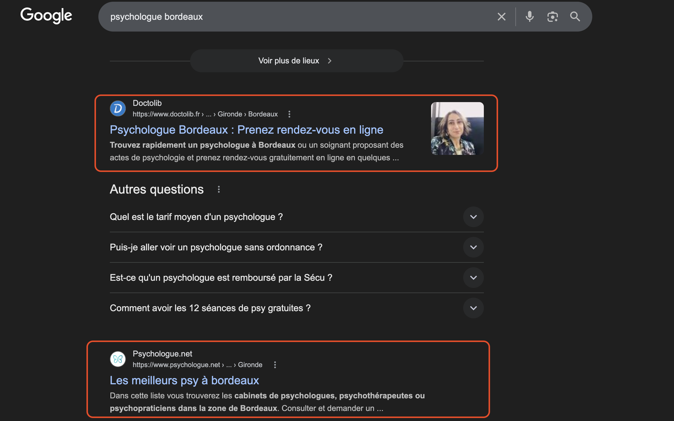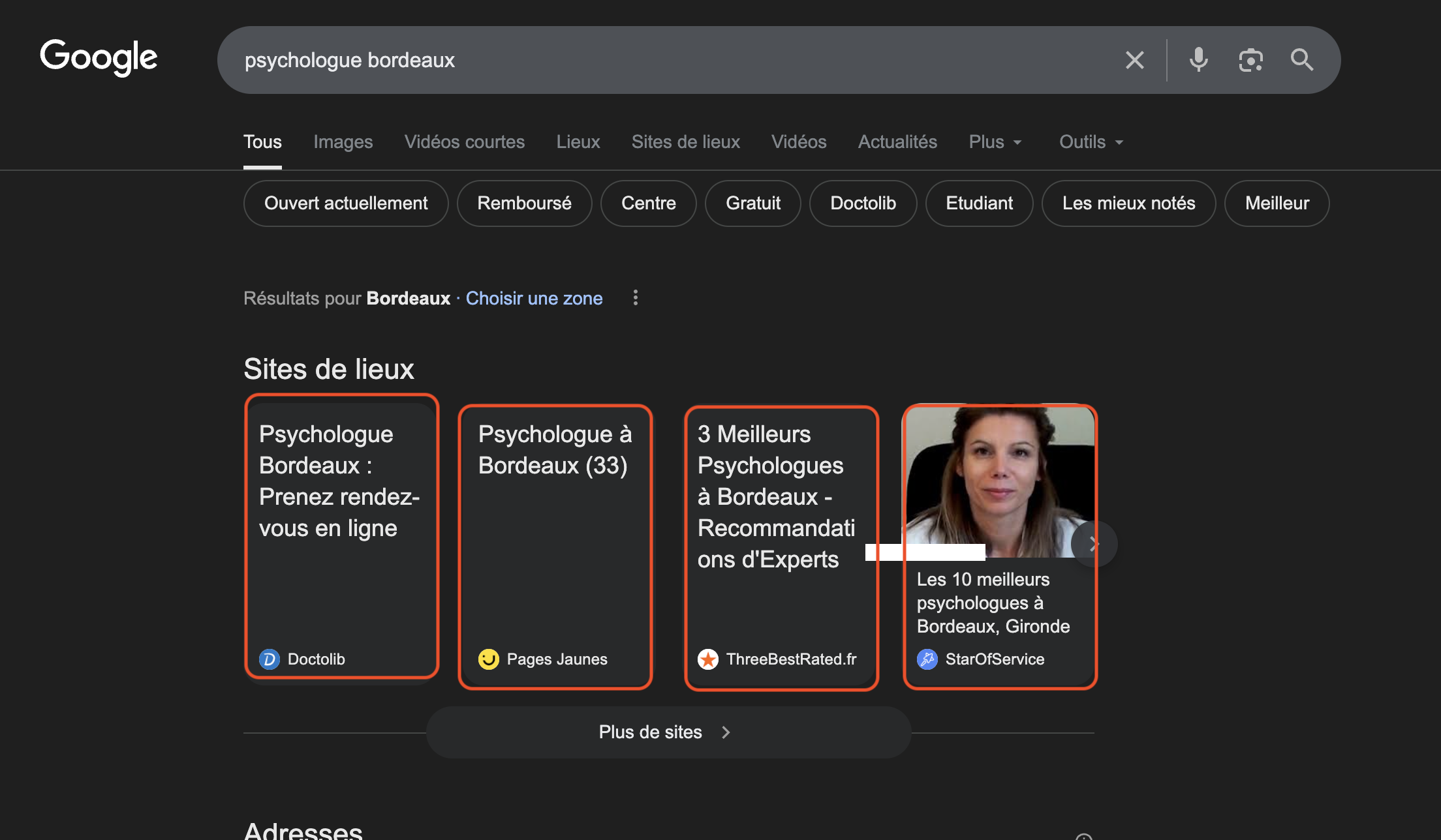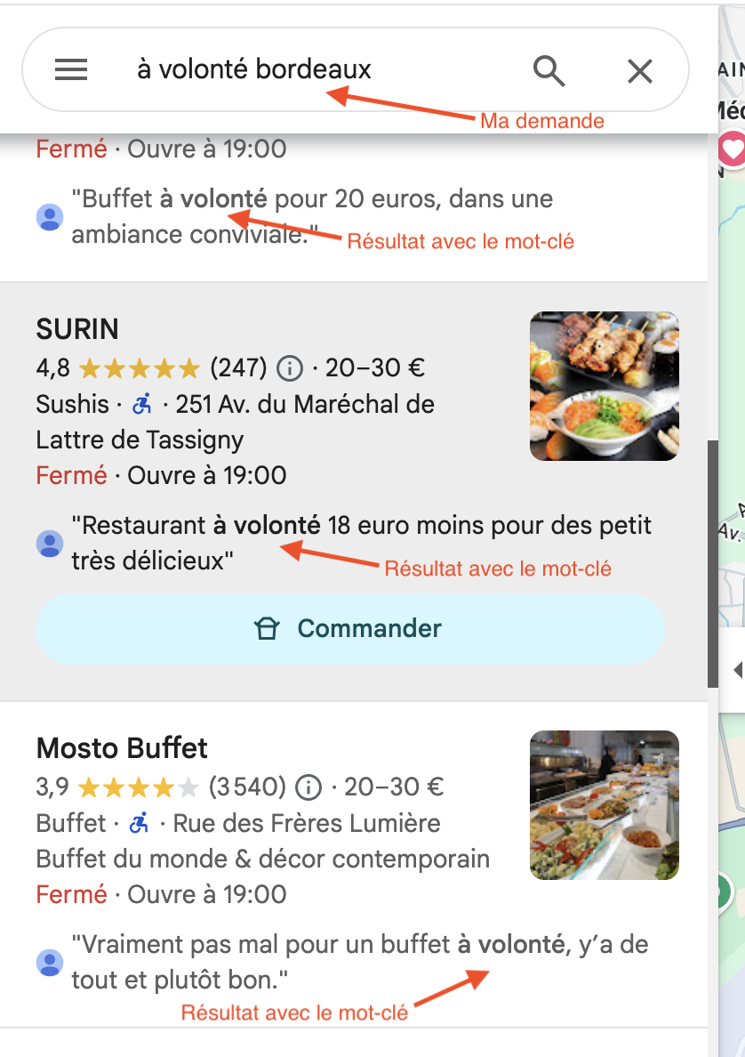 Et voici une astuce que peu de gens connaissent : Google Maps scanne le texte des avis pour les faire correspondre aux recherches des utilisateurs. Quand quelqu'un tape "coiffeur balayage Bordeaux" sur Google Maps, Google va chercher dans le texte de tous les avis et affiche en priorité les fiches dont les avis mentionnent ces mots, avec un extrait surligné directement dans les résultats. Concrètement, un avis qui dit "Excellent balayage, je recommande ce coiffeur à Bordeaux" a bien plus de valeur qu'un simple "Super, 5 étoiles".