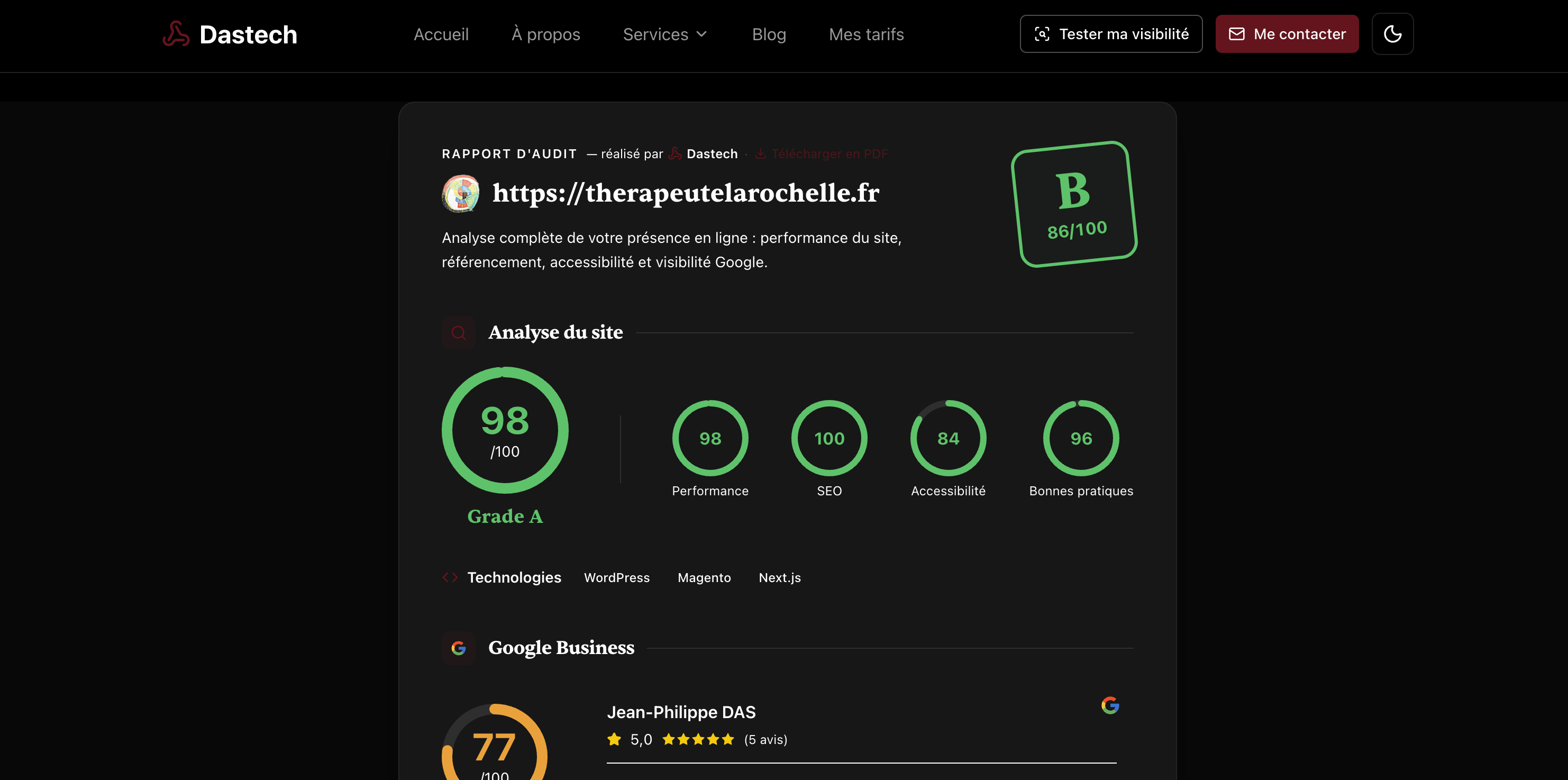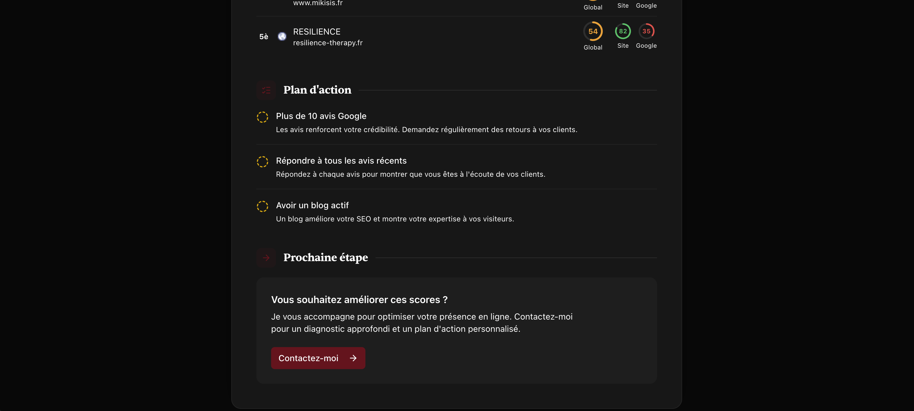 Pour vous faciliter la tâche, j'ai développé un audit de visibilité gratuit qui analyse votre présence en ligne. Il passe en revue votre fiche Google Business, votre site web, vos concurrents, et vous propose un plan d'action concret pour améliorer votre visibilité. En quelques minutes, vous savez exactement où agir en priorité.